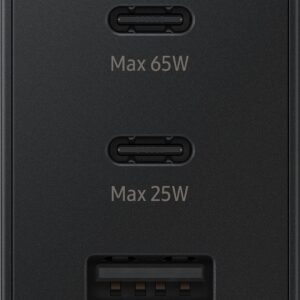 Le SAMSUNG 65W Power Adapter TRIO en coloris Noir vous permet de charger jusqu’à trois appareils simultanément grâce à ses trois ports USB-C offrant des puissances 65W, 25W et 15W. Compact, puissant et sécurisé, il est idéal pour smartphones, tablettes, écouteurs et même ordinateurs portables compatibles.