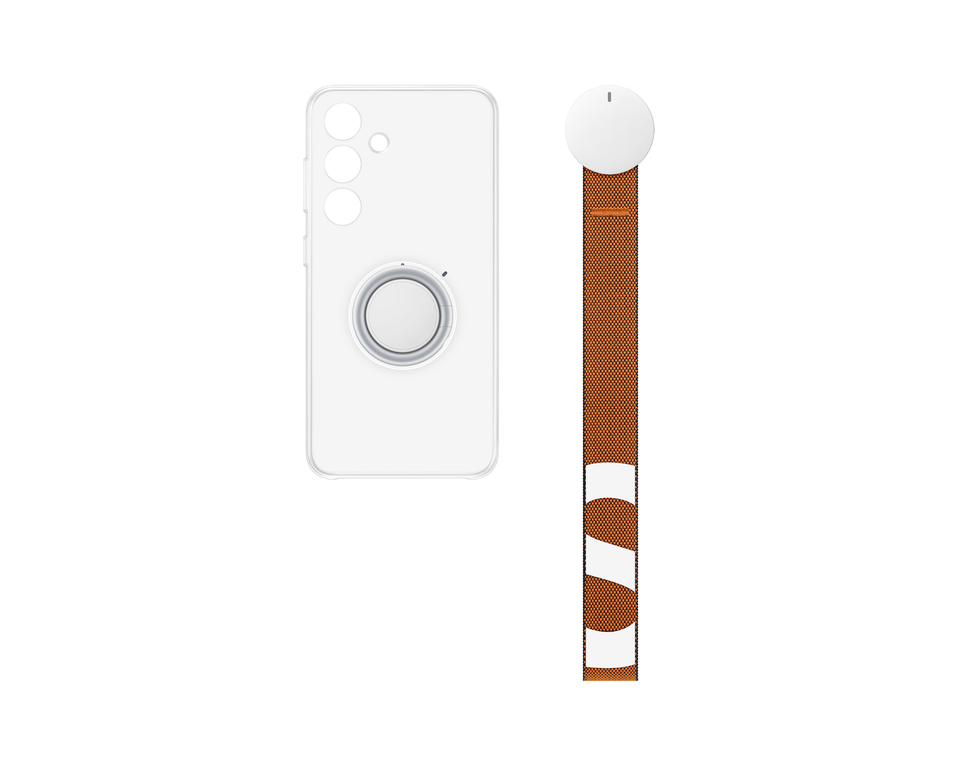 Cinq accessoires différents compatibles avec l’étui gadget transparent sont présentés. À gauche, une photo de l’arrière du Samsung Galaxy S24 dans l’étui porte-carte avec sa sangle orange. Ensuite, trois accessoires de prise en main, Grip SKZOO, Grip Smiley, Grip Minions, sont disposés parallèlement les uns aux autres, montrant la fonctionnalité de poignée amovible. En dessous se trouve le support de prise en main pour l’appareil photo qui, lorsqu’il est fixé, maintient fermement l’appareil pour permettre un visionnement mains libres.