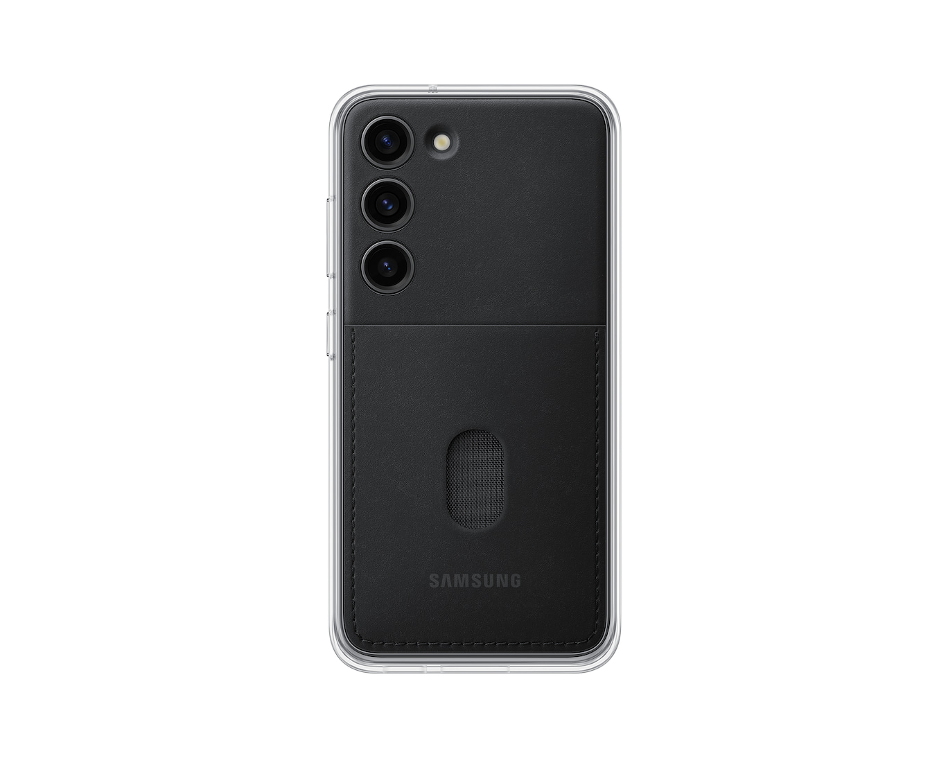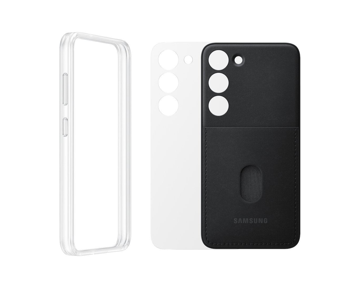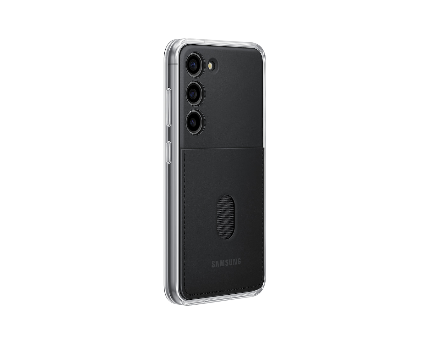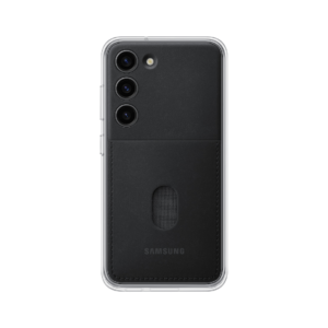 Deux coques sont disposées sur des Galaxy S23+. Celle de gauche a un dos noir et un porte-carte, la seconde est transparente.