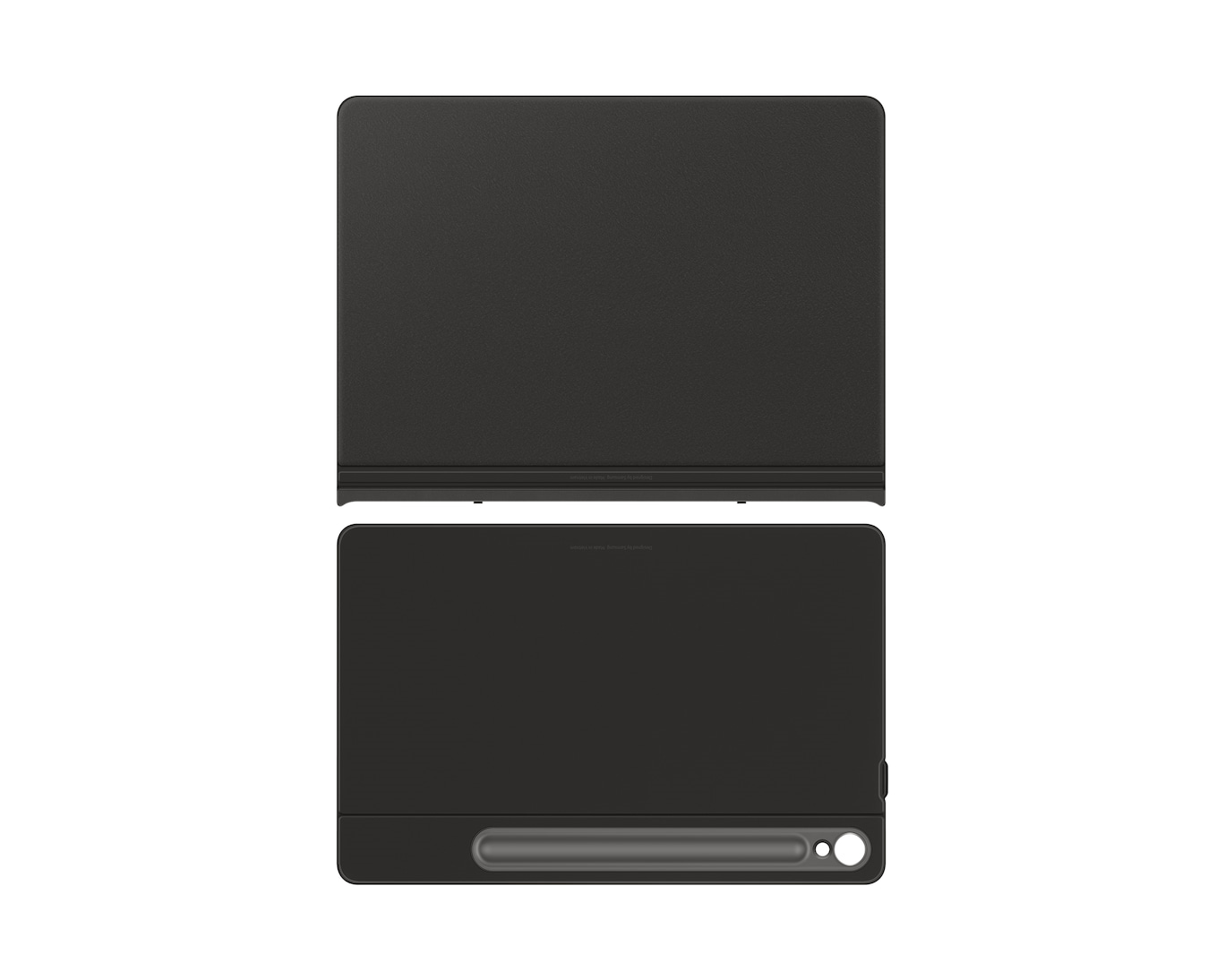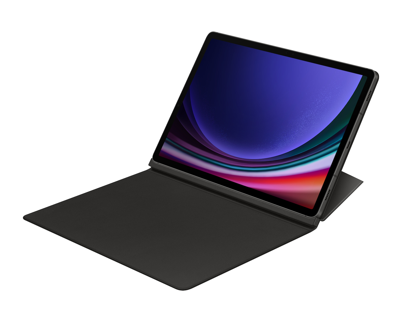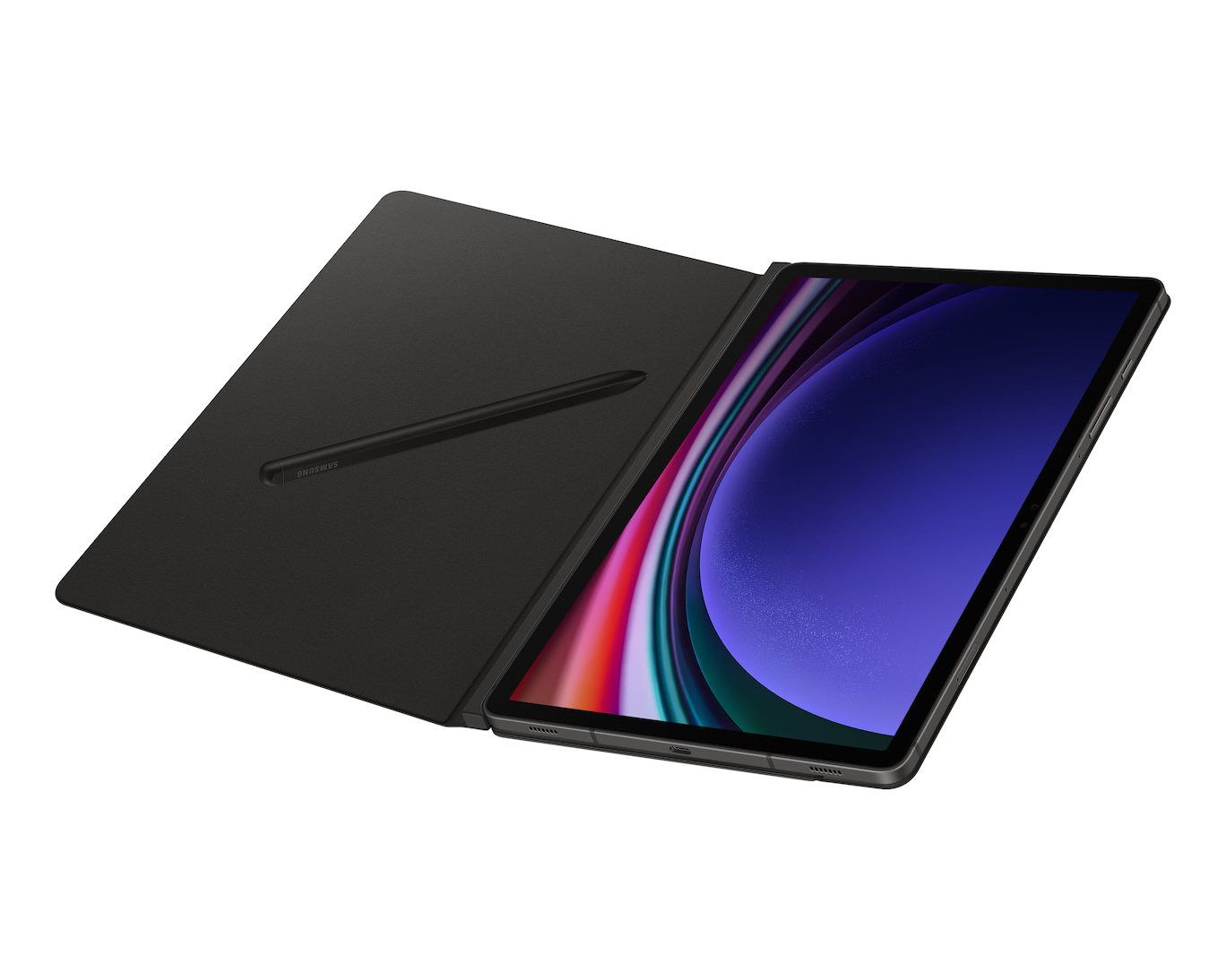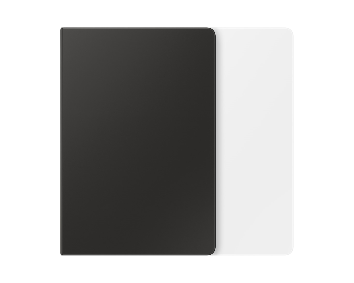Deux Galaxy Tab S9 enveloppées dans un Smart Book Cover, présentées à plat. L’étui d’un des appareils est légèrement ouvert avec l’écran allumé pour montrer la fonction de réveil automatique. L’autre est éteint avec l’étui abaissé.